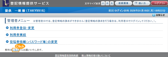 ログイン後に表示される「管理者メニュー」画面から、「解約はこちらからお願いいたします。」の「こちら」のリンクをクリックし、「解約申請」画面を表示します。