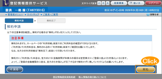 解約処理後のID番号(管理者並びに管理者配下の利用者全て)ではサービスの利用ができなくなります。