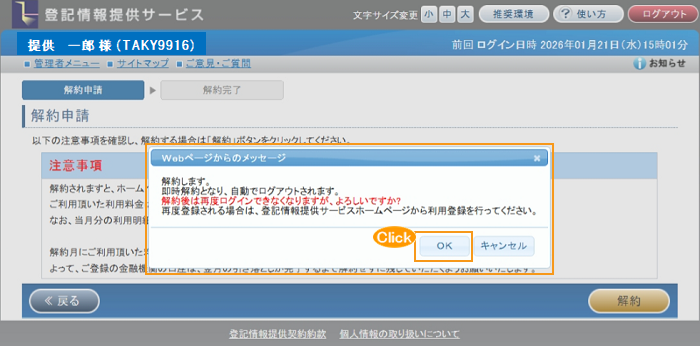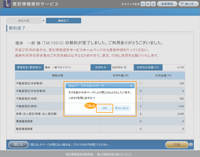 「画面終了確認」ダイアログで「OK」ボタンをクリックすると「解約完了」画面を終了し