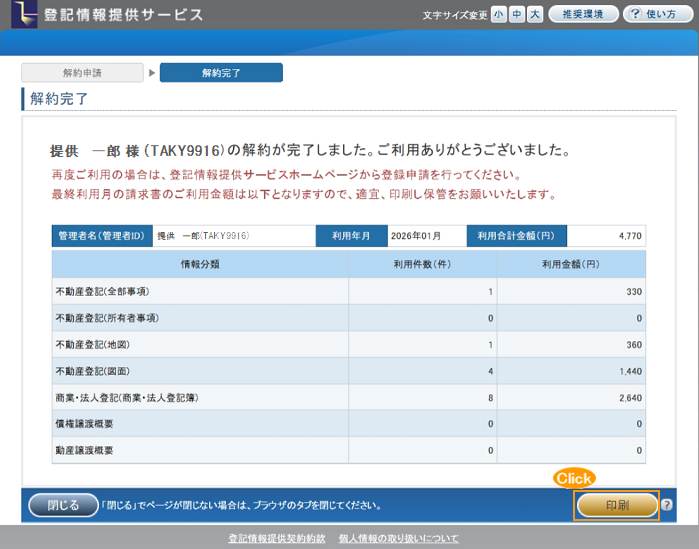 「印刷」ボタンをクリックすると「利用明細」を出力します。