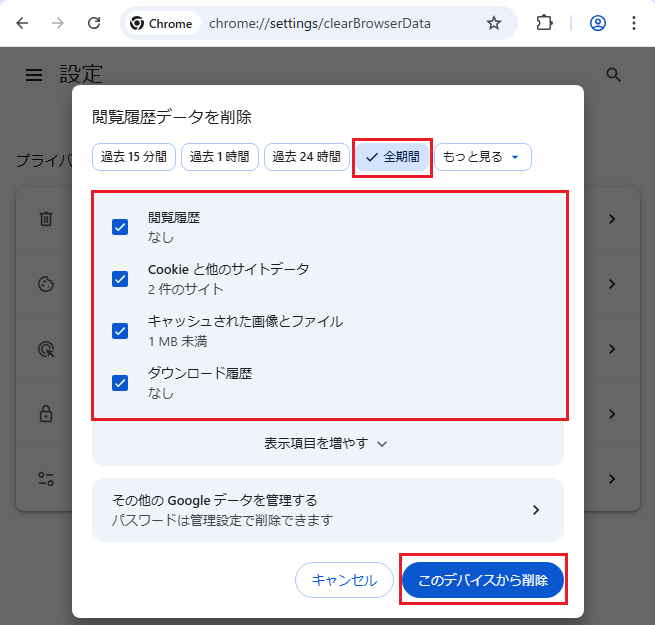 - [閲覧履歴][Cookieと他のサイトデータ][キャッシュされた画像とファイル][ダウンロード履歴]に☑を入れます。