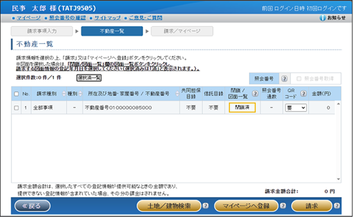 「不動産一覧」画面が表示されますので、本画面から即請求する場合は「請求」ボタンをクリックします。後でマイページから請求する場合は「マイページへ登録」ボタンをクリックします。複数件を選択し、一括して操作することができます。